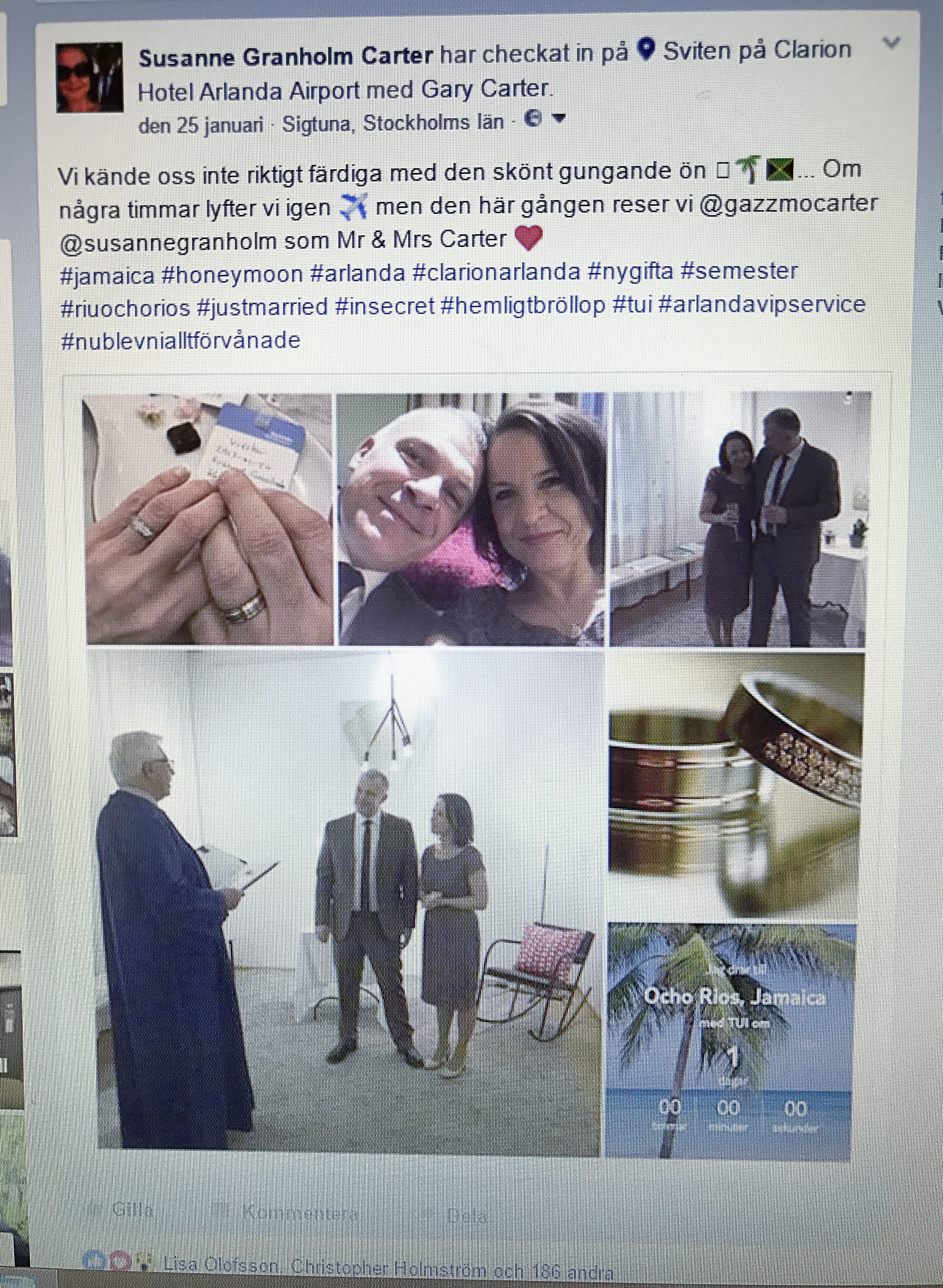 Samtidigt börjar praktikern i mig fundera. Hur fungerade det med passet när du plötsligt bytte namn? Eller gäller det ett tag till, byråkratins kvarnar hade kanske inte hunnit börja mala? Och hela vigselproceduren, det låter som om ni köpt ett ”paket” eftersom ni inte riktigt visste hur/var det hela skulle gå till? Så otroligt spännande och roligt allting. Jag anar hur ert FB-flöde såg ut efteråt!
