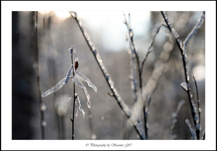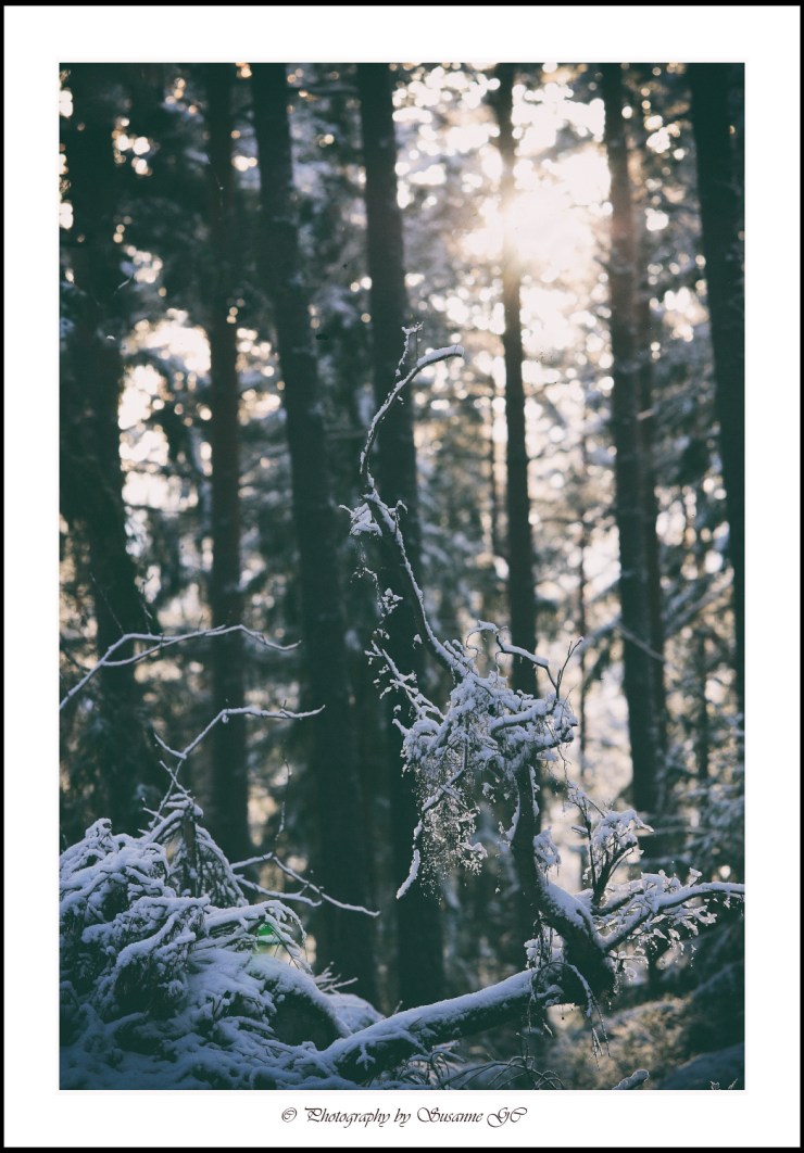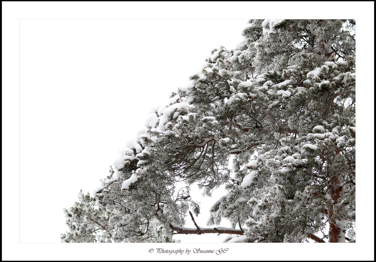 Snötäckt mark och snötyngda träd och grenar, frostbeklädda kottar och bär, likt ett landskap täckt av mjukaste bomull som skänkte oss en skön och välbehövlig tystnad.