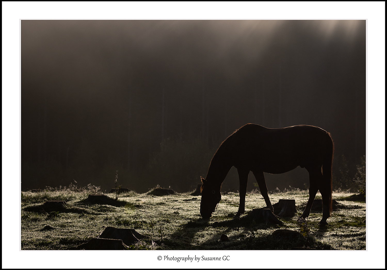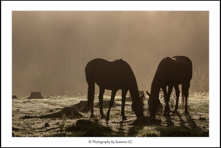 Vi hade hoppats på några vingbeklädda besökare ute till sjöss men tystnaden som rådde var nästan lite kuslig. Varför vi styrde bilen hemåt istället. Det var då vi fick syn på hästarna som lystes upp av solens första strålar genom trädens grenar. Naturen gnistrade likt diamanter och det var så fantastiskt vackert.