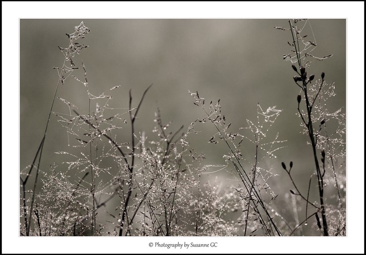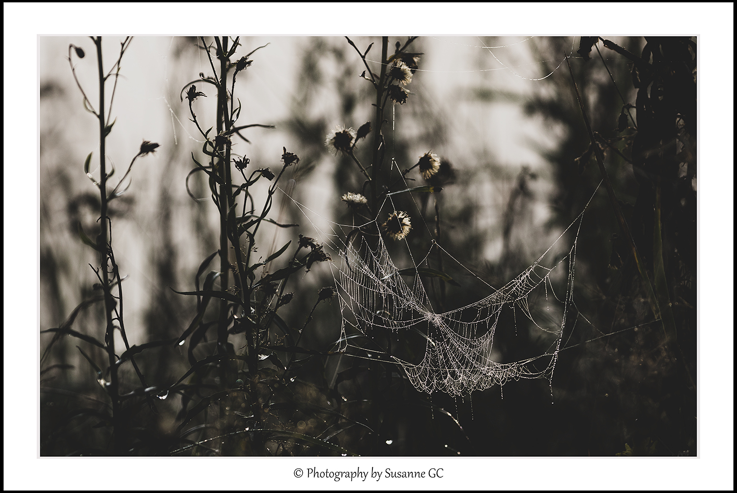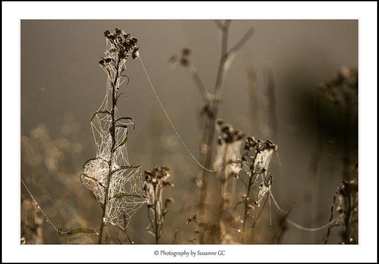 För hur det än är så behöver man inte alltid åka iväg så långt för att hitta motiven. Många av dom finns i vår närhet. Som spindelnätet som glittrade så vackert mellan blåbärsrisen i vår egen trädgård.