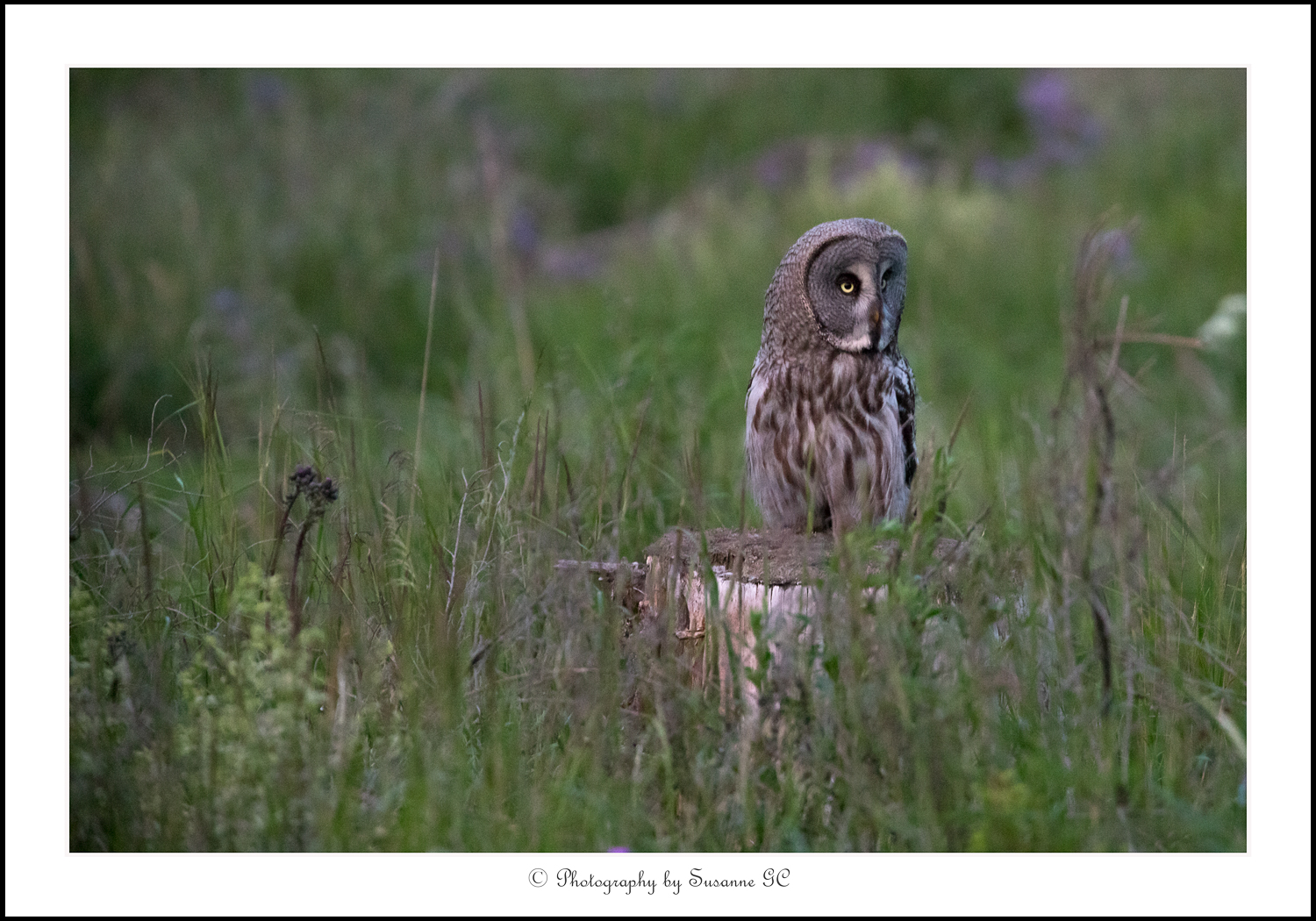 Rakt framför oss, på en stubbe nere i det höga gräset, typ 8-10 m framför oss sitter Lappugglan och spanar. Alltså, Wow!!! Det var som att den liksom ”- Hallå, ursäkta mig men här är jag! Ska ni redan åka?”