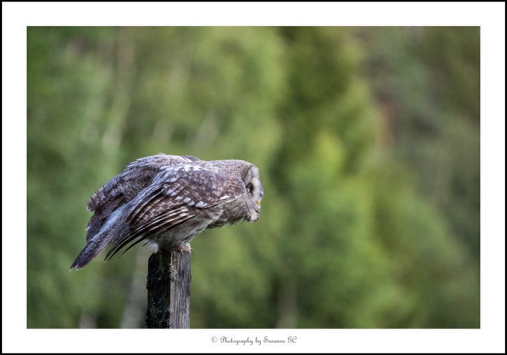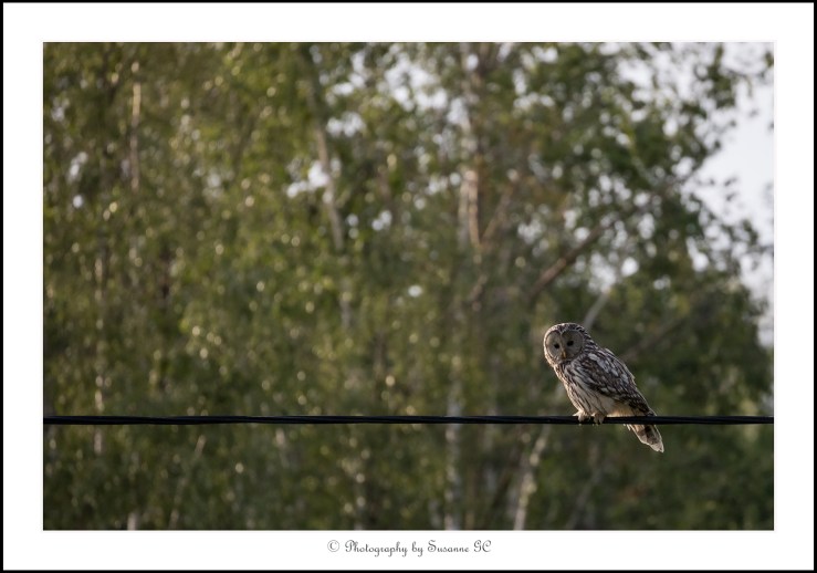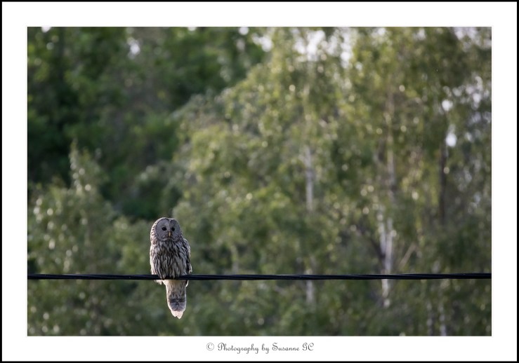 Den bytte utkiksplats en gång innan den flög över den lilla grusvägen och ängen för att landa långt bort i dom sommargröna granarna. Just här och nu borde man vara nöjd. Vi sa även på skämt att ”nu när man upplevt mötet med slagugglan kan man åka hem” OCH det kanske ni gjort MEN det gjorde inte vi 😉