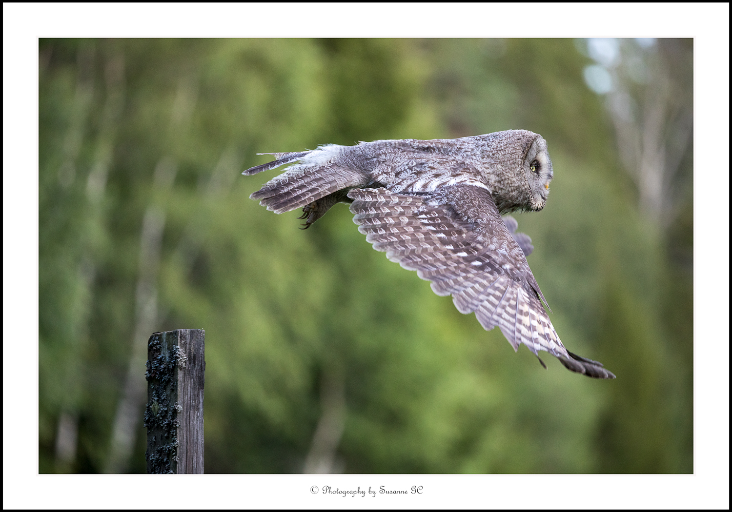 Vi kom åkande i bilen på den lilla grusvägen, när vi närmade oss platsen där vi vet att lappugglan håller till. Såg på avstånd några bilar stå parkerade en bit bort och några andra ”ugglespejare” som stod intill och språkade, med ryggen vända mot vårt håll. Vi saktade ner, redo att ta fram spejarblicken när det plötsligt kom en uggla från skogskanten på vänster sida. Den flög över den lilla grusvägen och satte sig på en staketstolpe på höger sida av vägen. Vi hoppade ut ur bilen som knappt hann stanna. Plockade ut kameran som, tack och lov, var färdiginställd och redo 🙂 (YES!!! Det är inget som hör till vanligheterna…meeen… har lärt mig av otaliga misstag!) Uppmärksammade att det var den vackra slagugglan som gjort entré och lyckopulsen sköt i höjden. Trots euforin lyckades jag skjuta av en 8-10 bilder innan den ca 20-30 sekunder senare flög tillbaka in i skogen. Dom andra ugglespejarna stod lugnt kvar och språkades, fortfarande med ryggarna vända mot oss och missade hela showen… Men vi!!! VI fick vara med och uppleva detta extremt kortvariga framträdande, men ack så lyckliga sekunder!