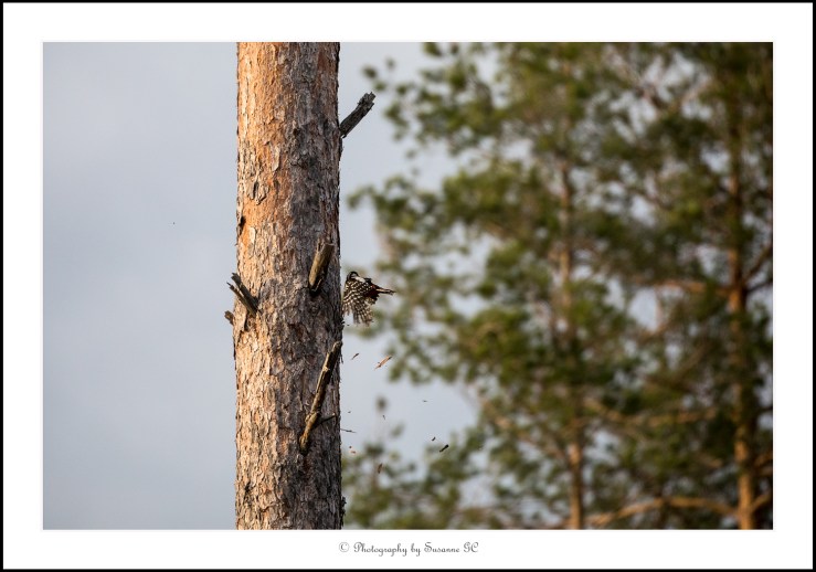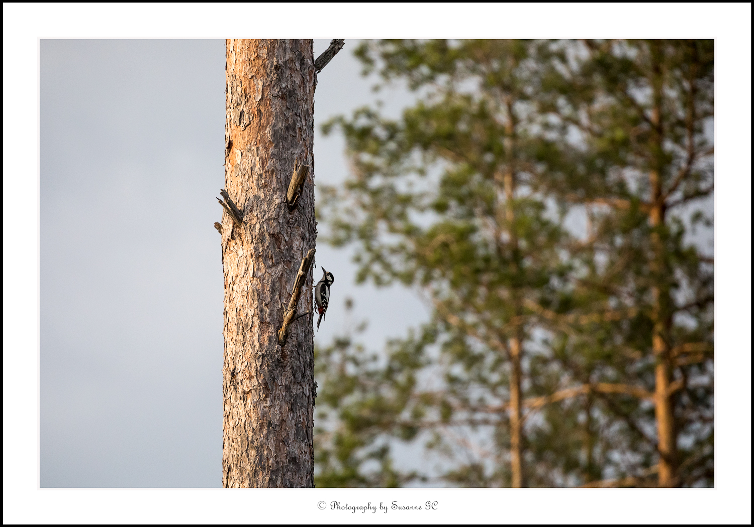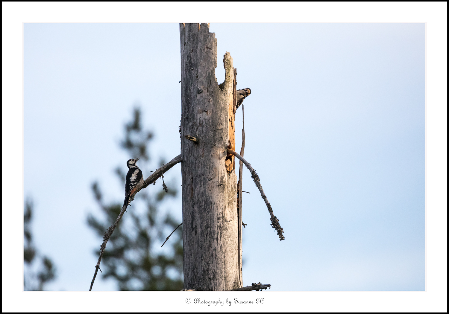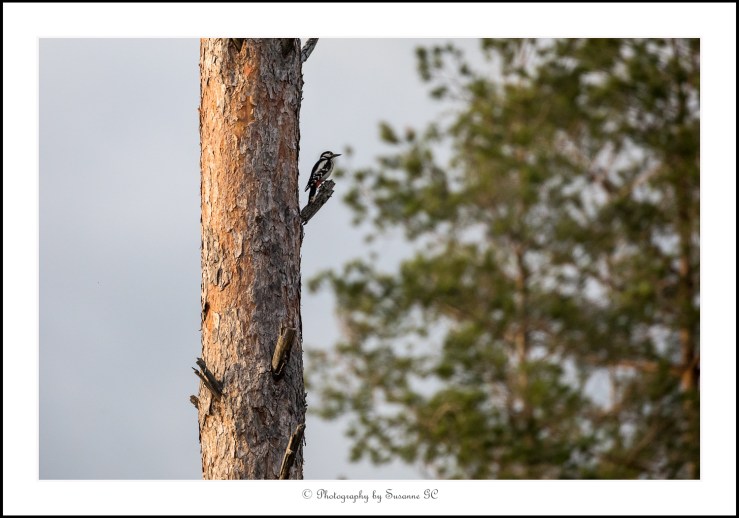 Stannade till på hygget där vi fick se två hackspettar fara omkring i träden och på torrakorna. Fick känslan av att dom lekte nån slags ”titt-ut” lek. Kanske var det syskon, kanske var det kärlek? Jag är ingen kunnig fågelkännare så jag har ingen aning men det är en fröjd att få uppleva och jag fotar gärna fåglar. Skulle gärna vilja lära mig mer men det får bli en annan gång i livet. Lär mig visserligen en del när man är ute och träffar trevliga fågelkännare som delar med sig av sin kunskap. DET är superkul och jag lyssnar tacksamt.