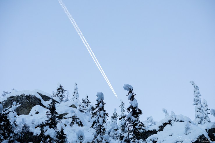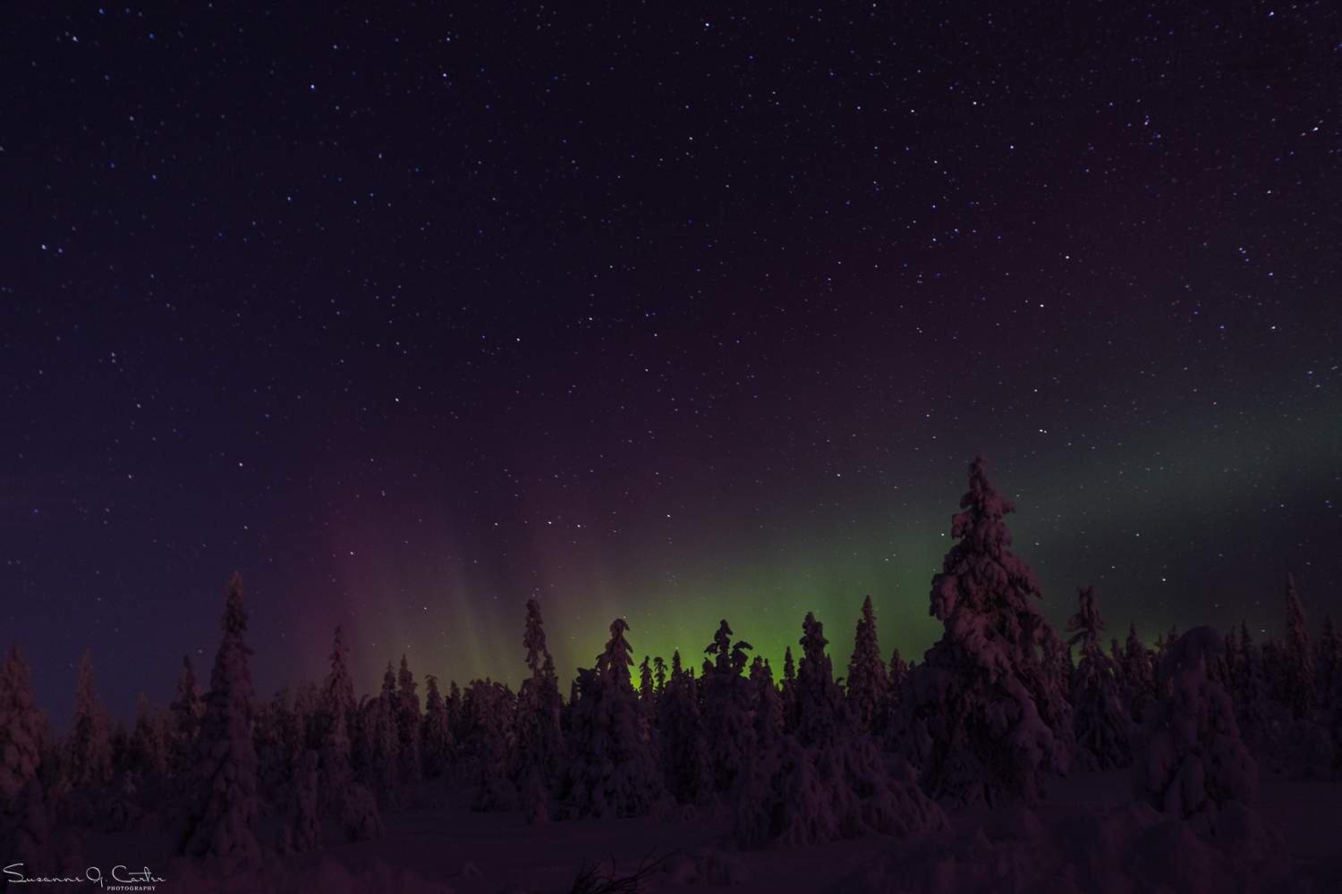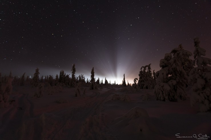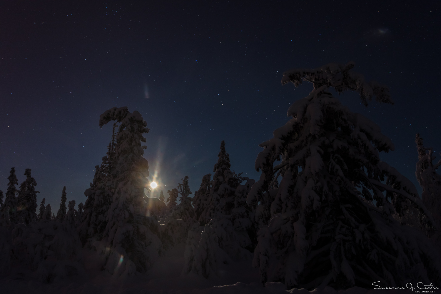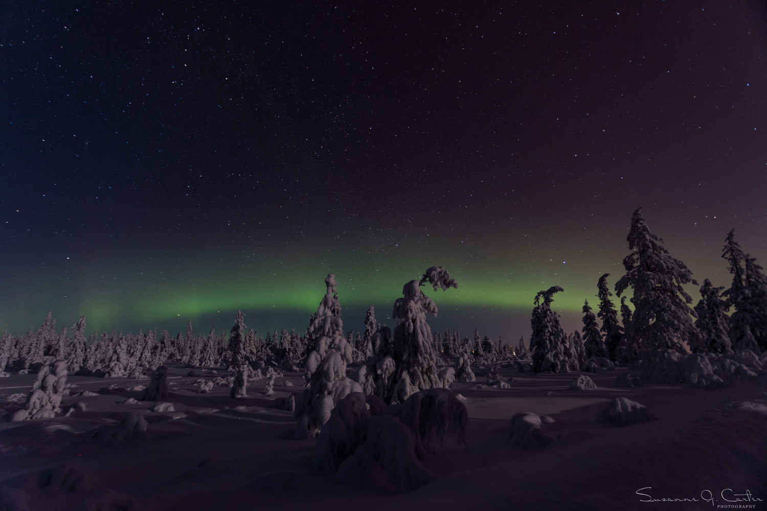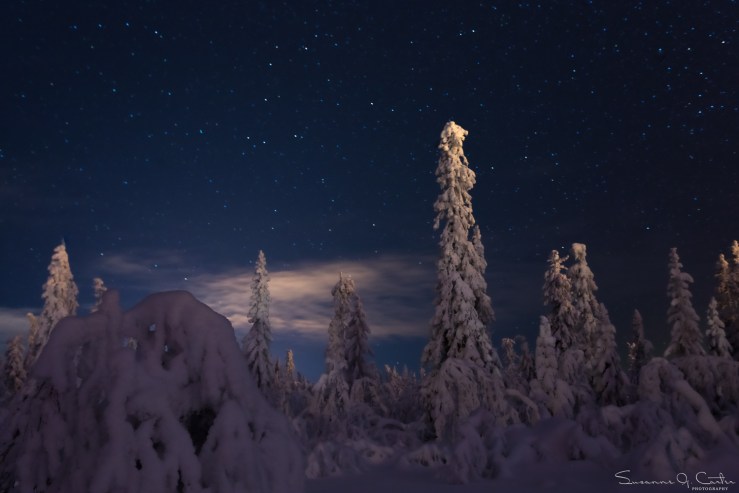 Vi gav oss av vid 21-tiden. Redan när vi hade parkerat bilen såg vi den gröna horisonten och kände hur det bubblade i bröstet av lycka och förväntan. Men som vi trodde så blev det inte optimalt med pistmaskinerna som lyste upp hela backen. Dock fick jag lite användning av dom när dom lyste upp dom snötäckta trädtopparna och gav mig möjligheten att fånga landskapet som bara finns i sagoböckerna. Som att kliva in i landet Narnia ❤