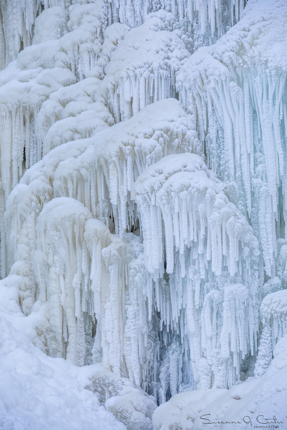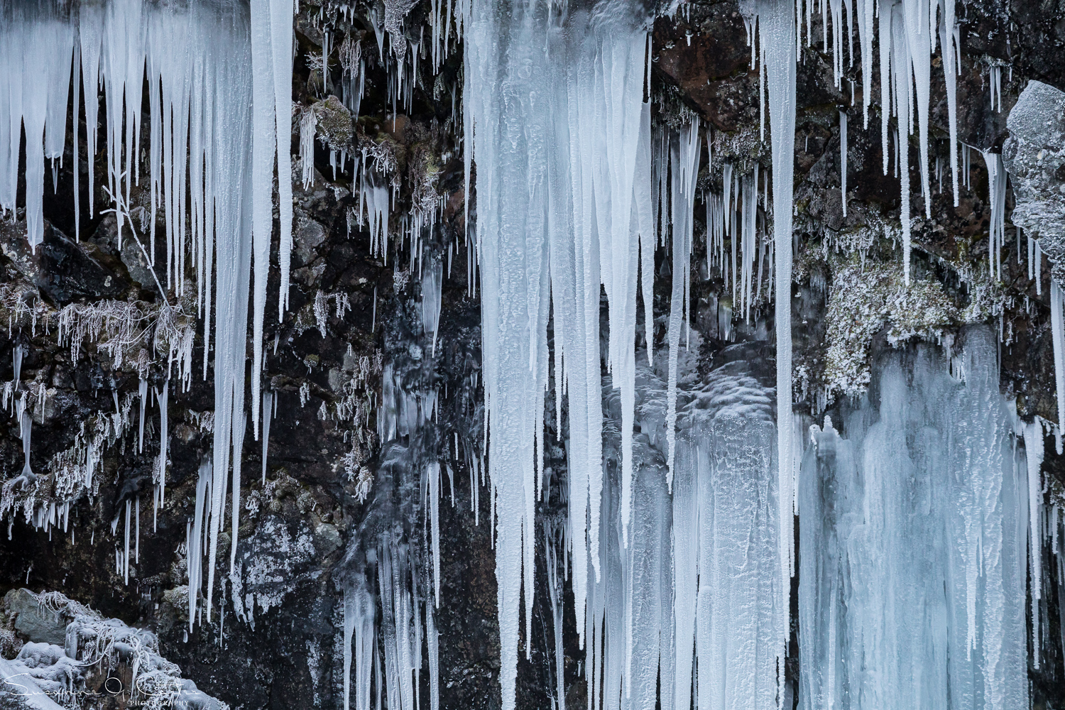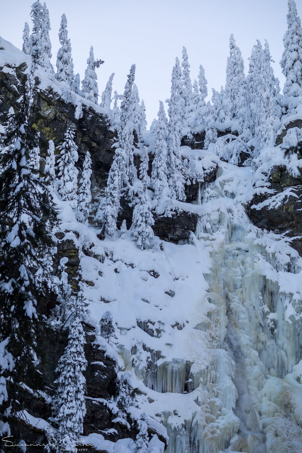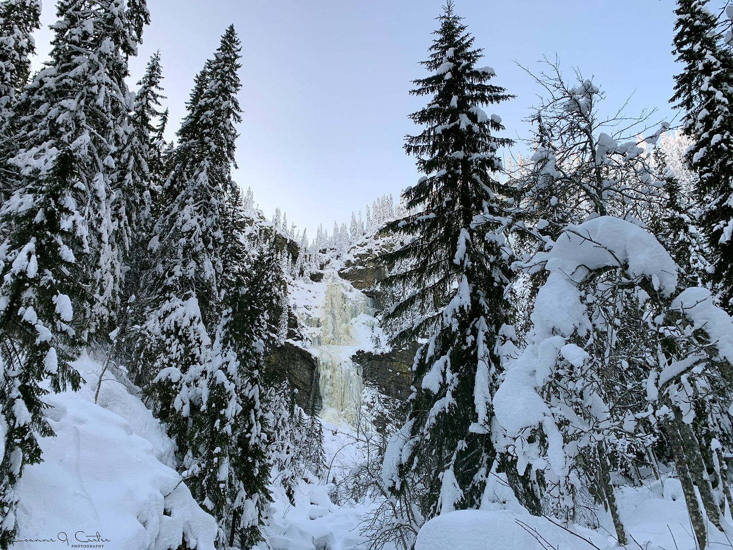Att fota i -27° C är inte helt enkelt. Fingrarna blir snabbt stela och bortdomnade och värken tar över. För att inte prata om tårna… Så länge man håller sig i rörelse är det inga problem men att stanna upp, om så för en ynka kort liten stund… Det är liksom ödet. Så efter vårt korta lilla fotostopp och beundran vid fallet så fick vi snabbt börja vandringen tillbaka till parkeringen igen. Tårna förblev kalla hela vägen tillbaka och den fyllda kaffetermosen fick följa med hem igen 🙂