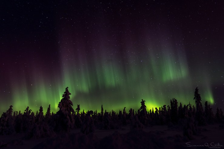 Till en början syntes ”bara” den gröna bågen och vi tog en mängd bilder där vi testade olika inställningar. Med en medhavd ljuskälla lyste vi upp förgrunden för att ställa skärpan. Vi har ju förstås läst på kring norrskensfoto och hur man ska gå tillväga men eftersom vi är nya på det här området så ville vi testa olika inställningar. Alla som berättar och skriver säger lite olika. Många grundinställningar är densamma men sen finns lite olika tips. Verkligen superspännande, roligt och jäkligt frustrerande… Särskilt när det inte blir den där pangbilden man så klart hoppas på 😉