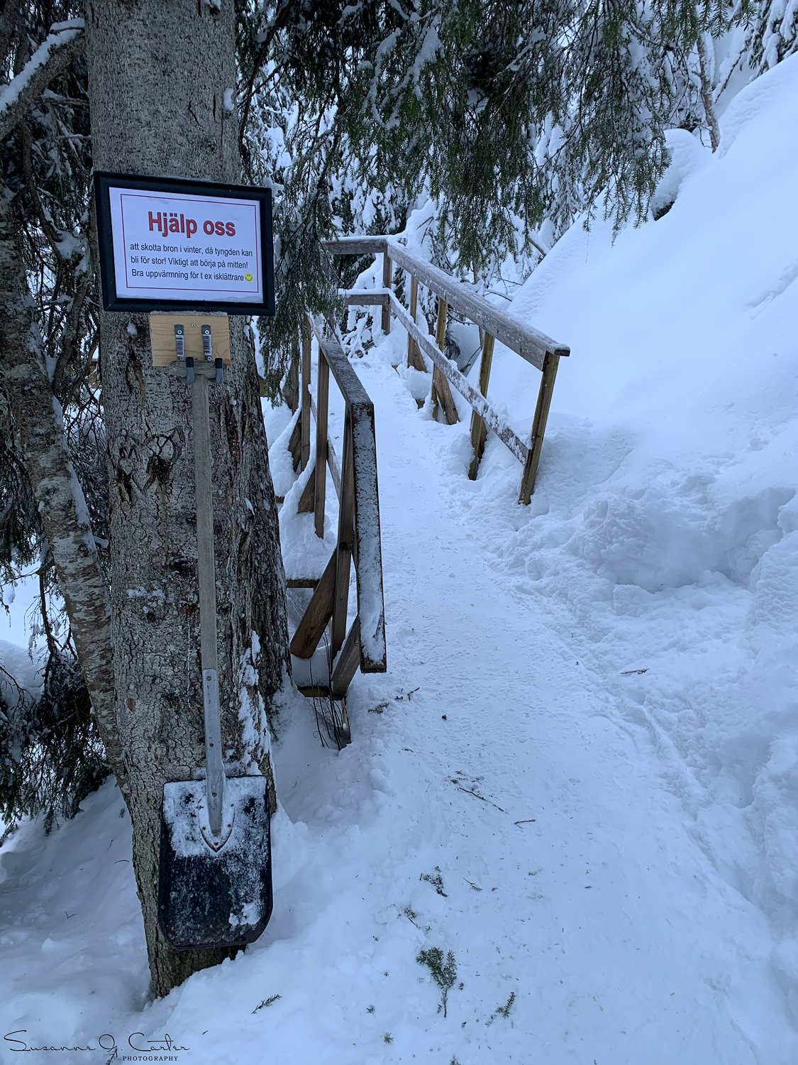 Från parkeringen är det en vandring på ca 2 km längs Fettjeån innan man når fallet. Vi trodde nog när vi begav oss av att vi skulle vara dom enda knasiga två som tog oss ut i kylan 😉 men trots denna ”något friska” januaridag så mötte vi många frostbeklädda besökare som också var där för att se Fettjeåfallet.