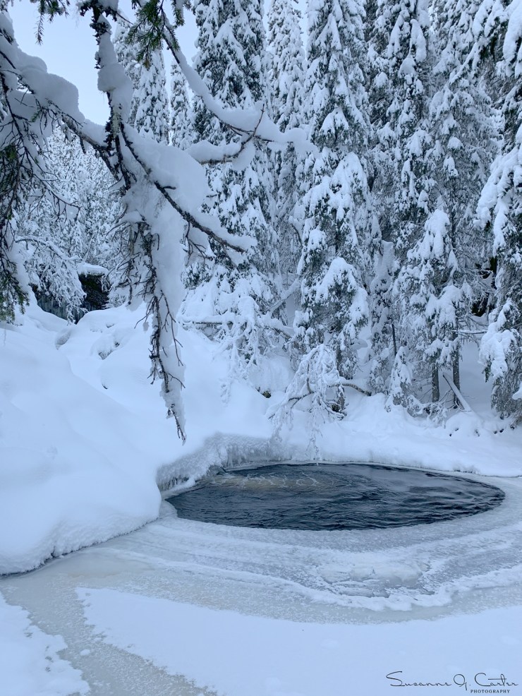 På veckans absolut kallaste dag, när alla medhavda ullunderställ kom till användning, när termometern visade -27° C… Ja, men då bestämde vi oss för att åka på utflykt 🙂 🙂 . Det var så galet krispigt vackert att vi helt enkelt inte kunde stanna inne och bara titta ut hela dagen och tänka att det var för kallt. Nej, nej… Vi tog kaffetermosen och kameran och åkte till Fettjeåfallet som ligger strax utanför Klövsjö. Ca 4 km från där vi bodde.