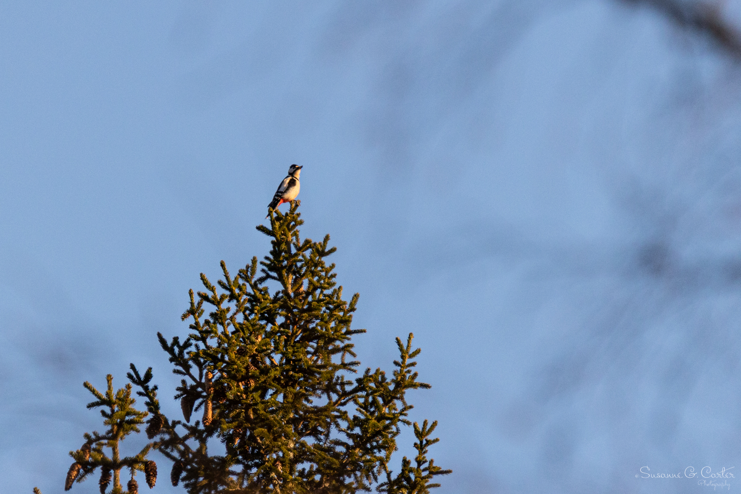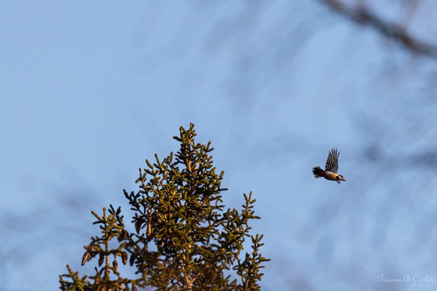 Misstänker att det var hackspetten som låg bakom flykten när den svepte förbi på nära håll och höll låda med sitt skränande läte för att strax därpå sätta sig i en annan topp, strax intill…