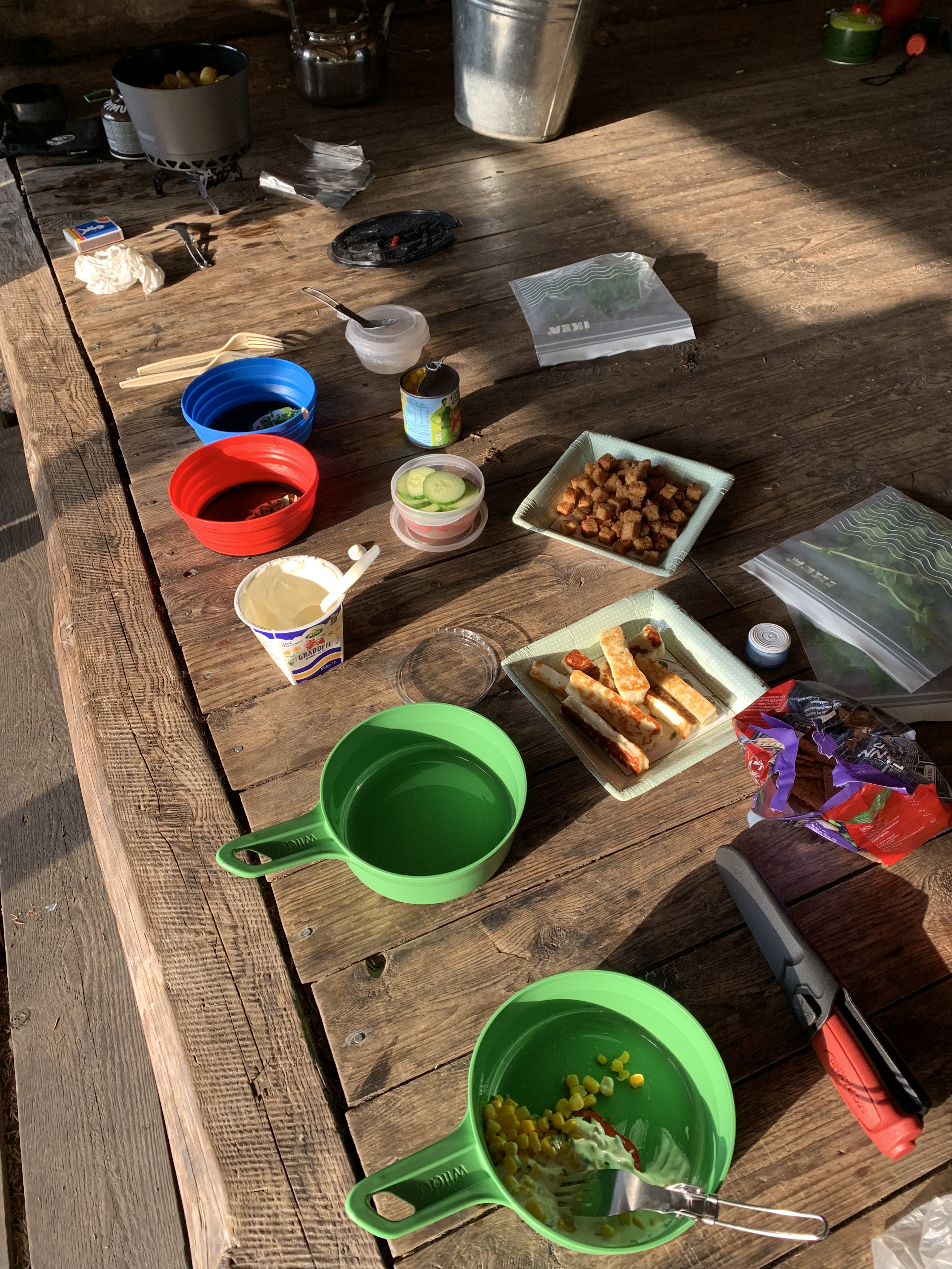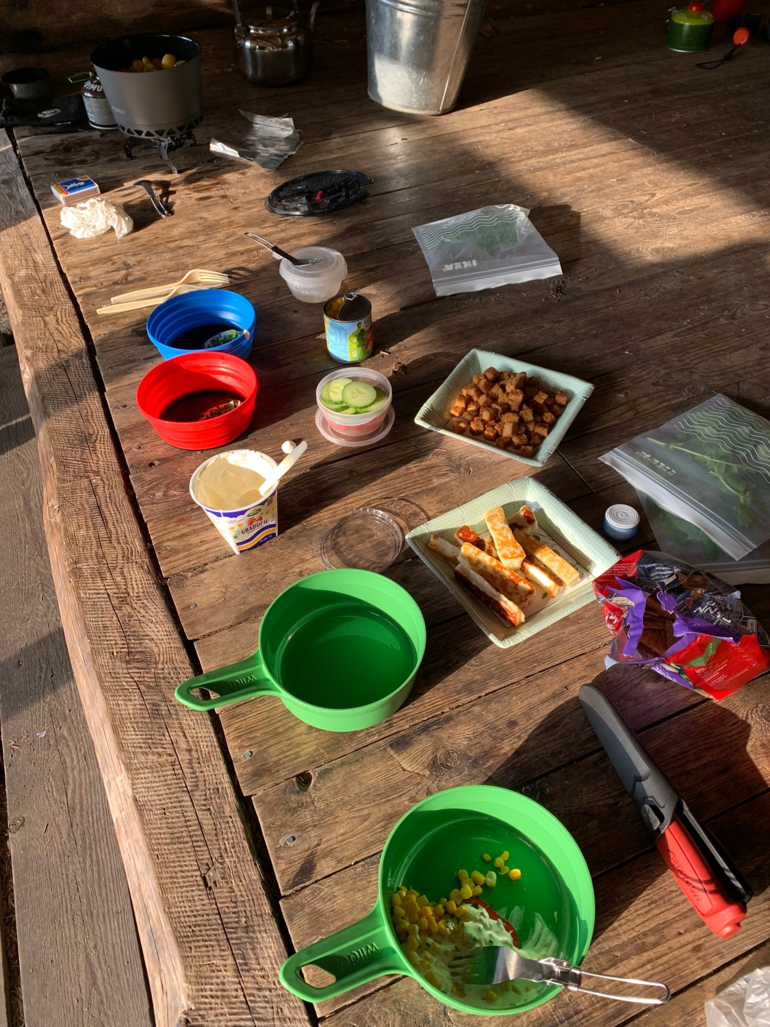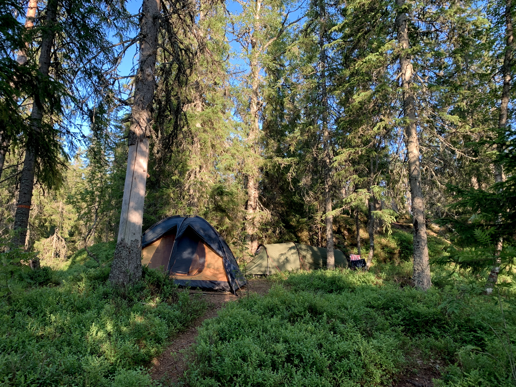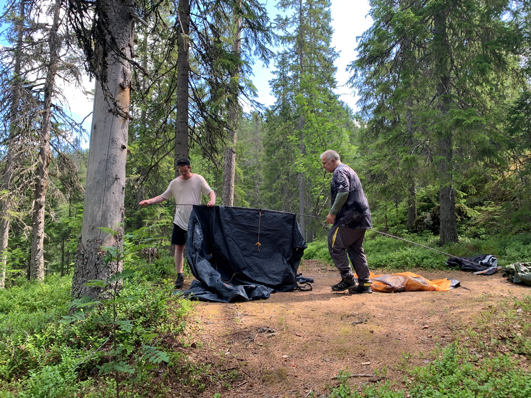 Även om vi inte riktigt kände oss superbekväma med uppresningen av tälten så måste jag säga att vi ändå lyckades riktigt bra. Sen att det lutade både hit och dit och att underlaget var ojämnt och bestod av grenar, rötter, kottar, stenar… Det får man bara gilla och tänka på i vilken riktning man tänkt sig att sova.