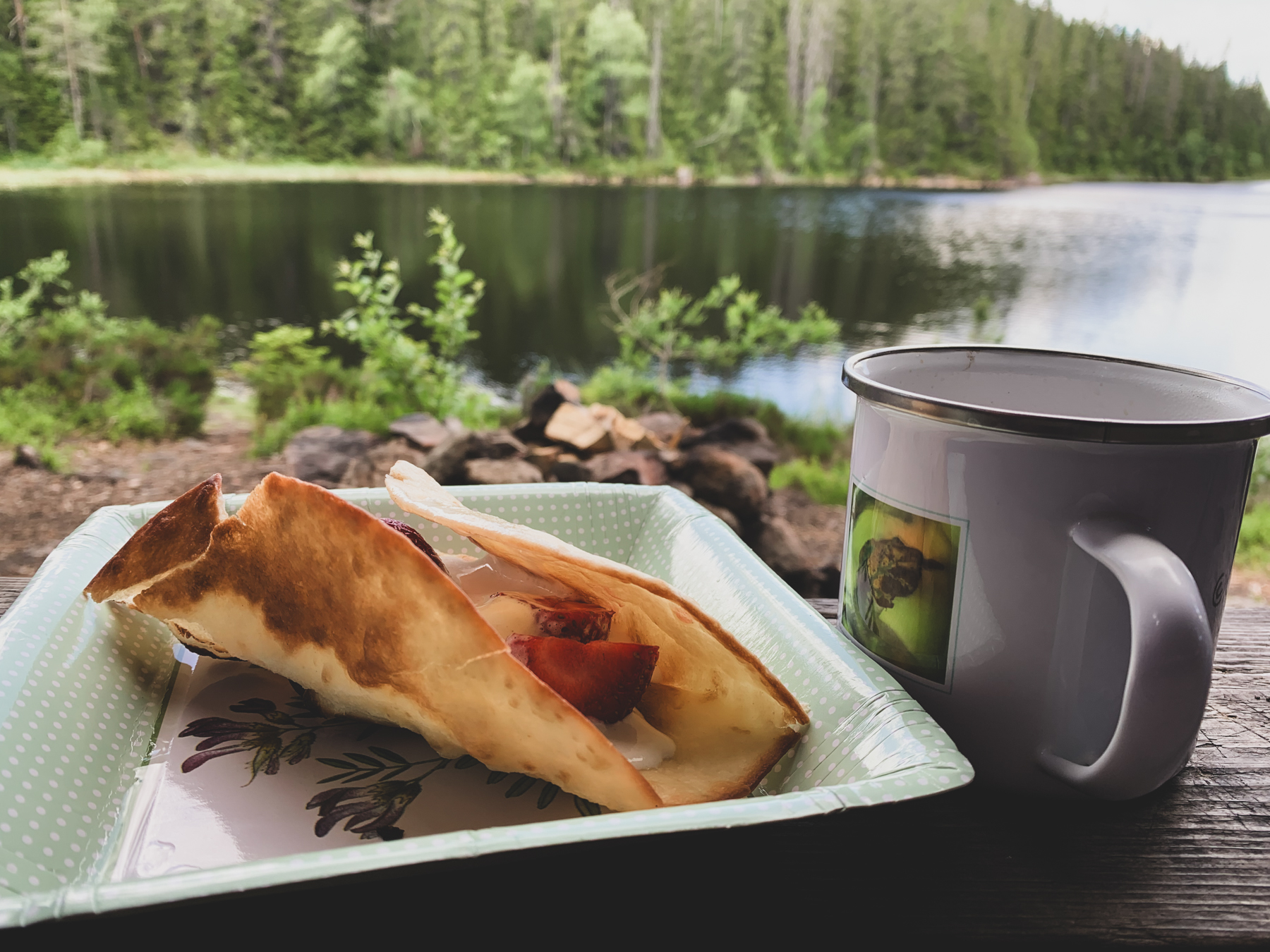 Någon jordgubbstårta fick inte plats i packningen men väl något som i min smak var betydligt godare. Frasiga tortillabröd stekta i olja och formade innan dom kallnat. Fyllda med vaniljglass och jordgubbar. Serverade med nykokt kaffe i den vackraste av miljöer i härligt sällskap ❤