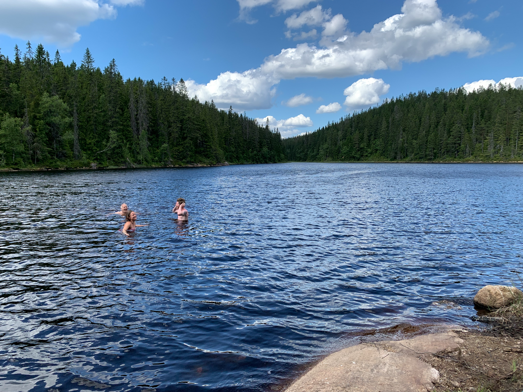 Midsommarhelgen gav mersmak och det kommer med all säkerhet bli fler äventyr i det vilda. Nästa gång kanske vi ska testa att sova i våra inköpta men oanvända hängmattor. Ska nog bara fixa ett myggnät först. En fråga som för alltid kommer att bli obesvarad är: VEM simmade ut i tjärnen, vände om och simmade in till land igen???? Det vi vet är att det inte finns någon stig i närheten och naturen är inte helt enkel att beträda intill… SÅ vem var det???