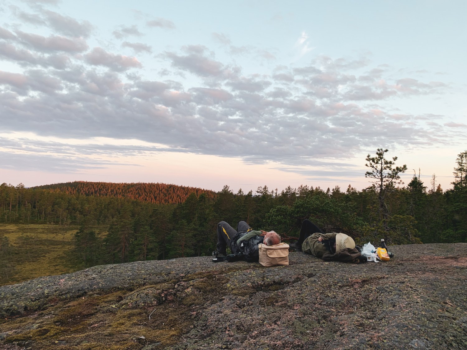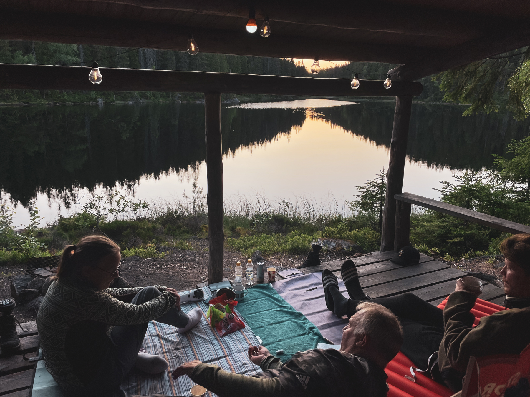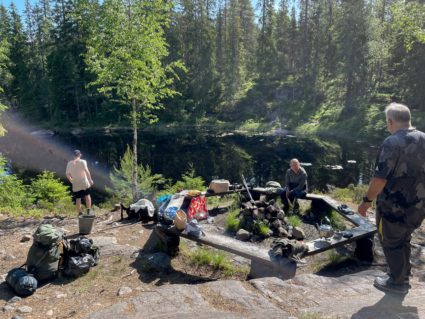 Tjärnens klara vatten låg som en spegel och i träden hördes fåglarna sjunga upp. Knotten var fortfarande en plåga och käken höll nästintill på att hoppa ur led av allt gäspande. Dom yngre kraschade omedelbart i tältet för lite sömn och det dröjde inte länge förrän även den äldre generationen kände ett behov av att fylla på sömnbanken. Men innan kudden blev aktuell tog vi oss en stund med att bara sitta på stenhällen och ta in den friska luften, den vackra vyn och frihetskänslan.
