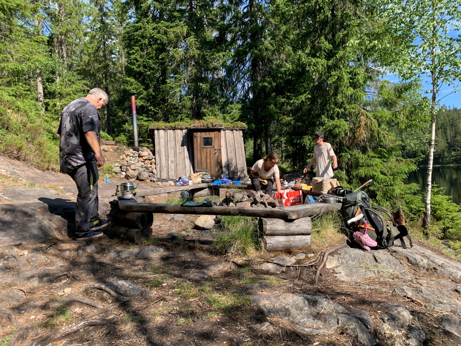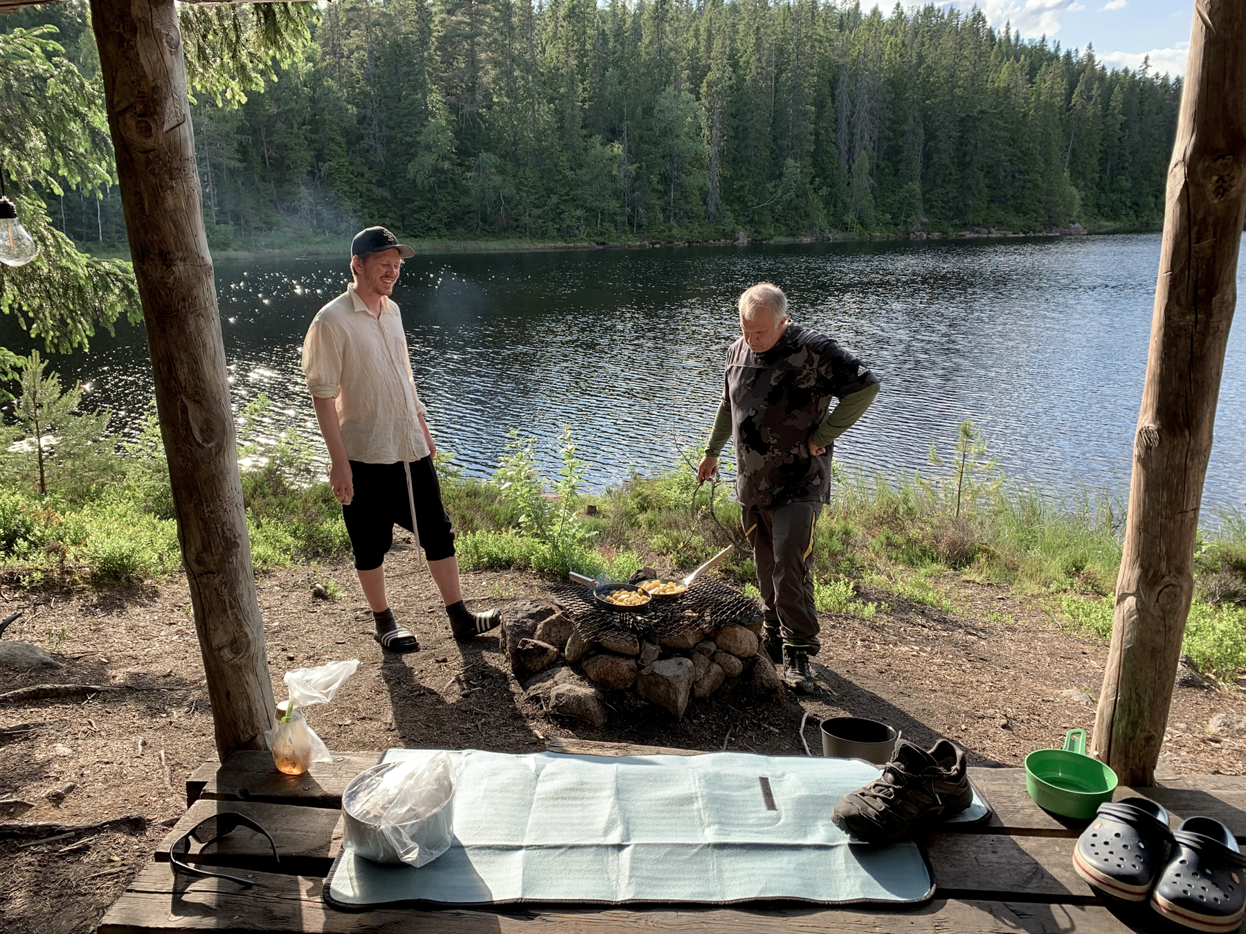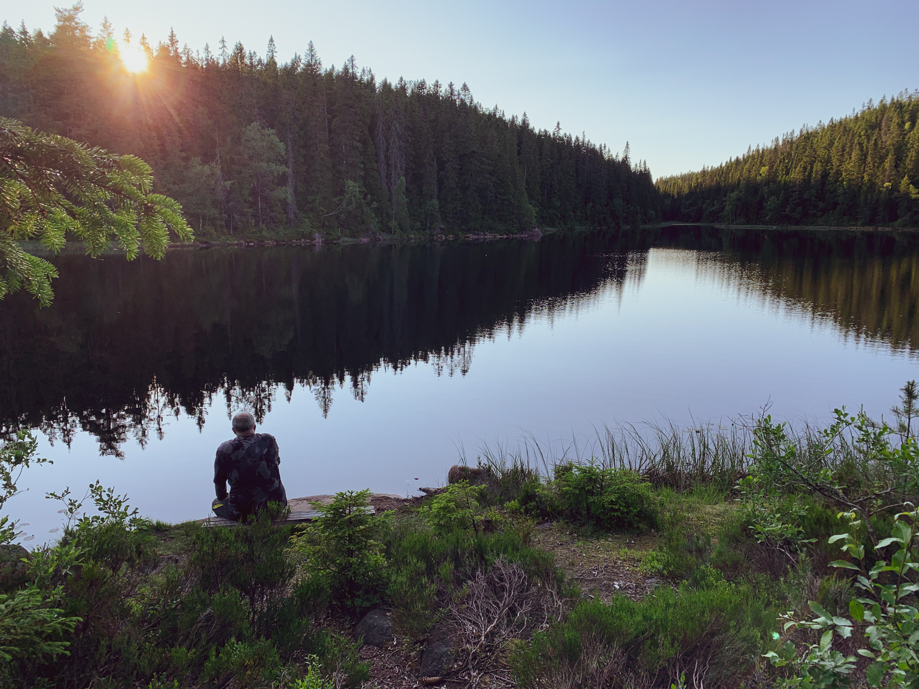 Tjärnens klara vatten låg som en spegel och i träden hördes fåglarna sjunga upp. Knotten var fortfarande en plåga och käken höll nästintill på att hoppa ur led av allt gäspande. Dom yngre kraschade omedelbart i tältet för lite sömn och det dröjde inte länge förrän även den äldre generationen kände ett behov av att fylla på sömnbanken. Men innan kudden blev aktuell tog vi oss en stund med att bara sitta på stenhällen och ta in den friska luften, den vackra vyn och frihetskänslan.