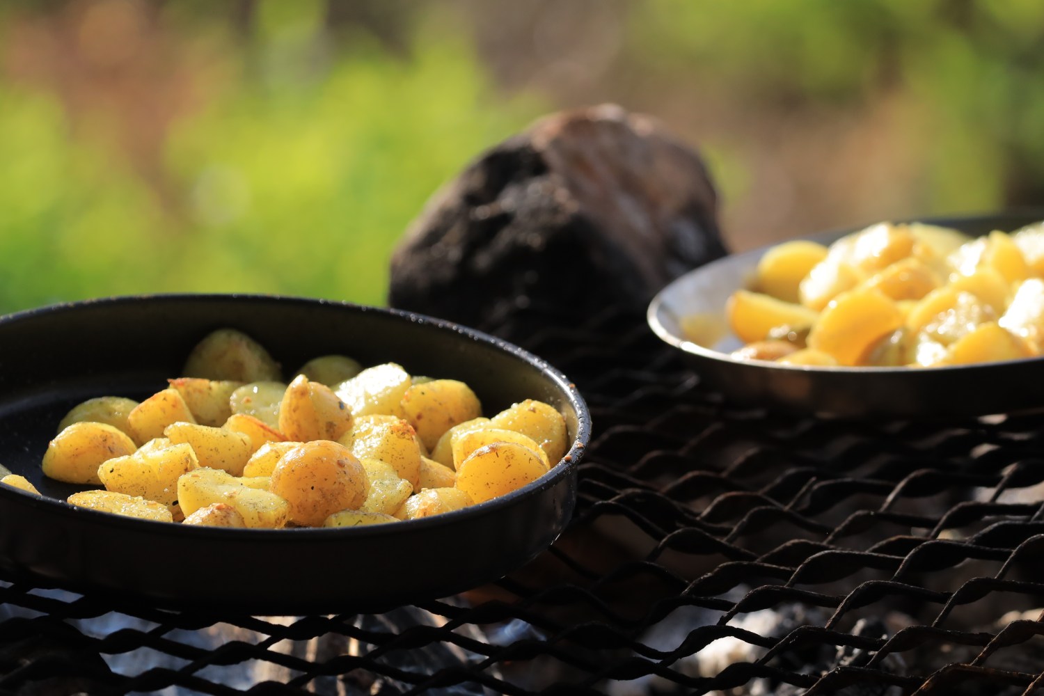 Stekt färskpotatis, halloumi, grönsaker, färska örter, gräddfil och lite annat plock satt fint i magen.
