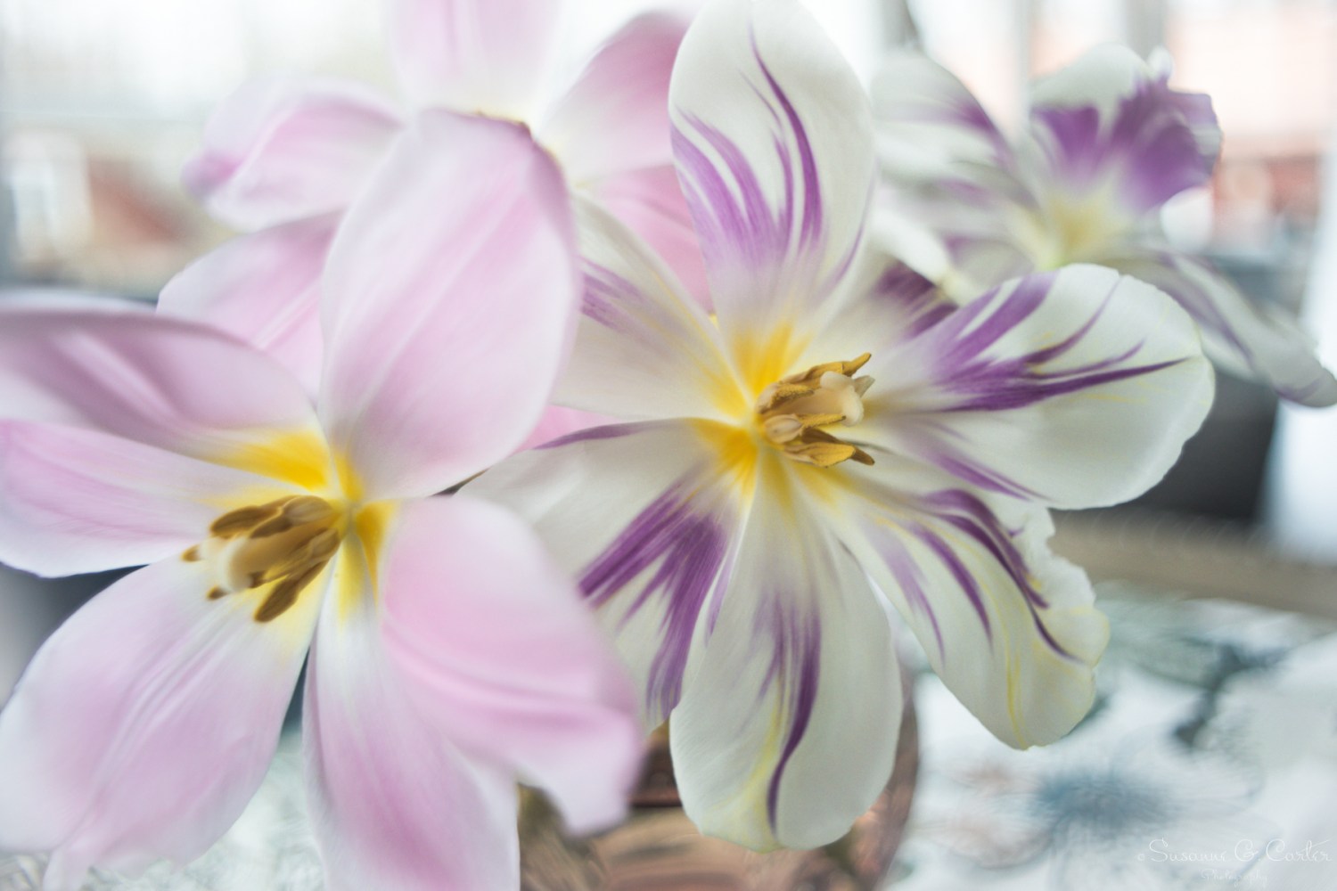 Fint rimmat och en underbart vacker fotoserie på pastelliga tulpaner! Vända på bladen? Har du för hand böjt ut kronbladen?