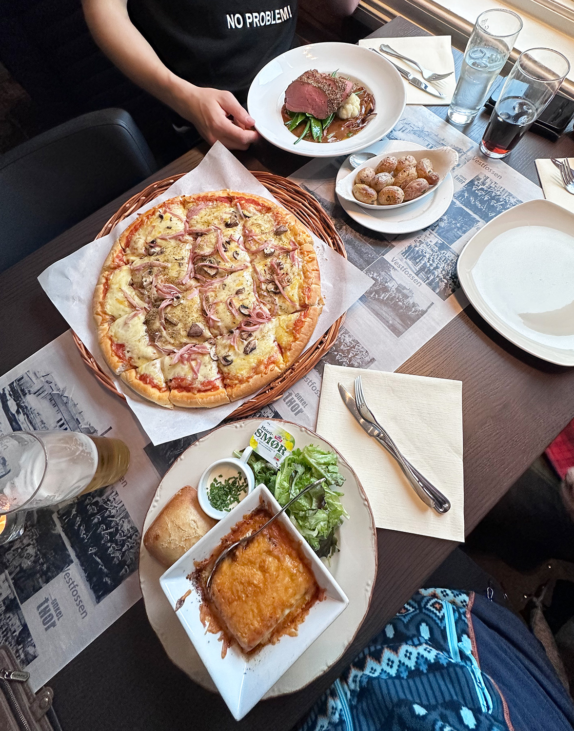 Trötta och slitna gick vi till sängs, på olika håll, efter att ha mättat våra magar med en bit take away-pizza i sonens lilla studentlägenhet. Ett boende som klubben hjälpt till att ordna. Vi bäddade ner oss i dom enorma täckena på Quality Hotel Grand. Om ni bott på hotell i Norge har ni också kanske fått försvinna in under dom enorma täckena som är som ett stort och fluffigt tält 😉😅. Kanske är det inte så överallt men där vi bott har det varit precis så.