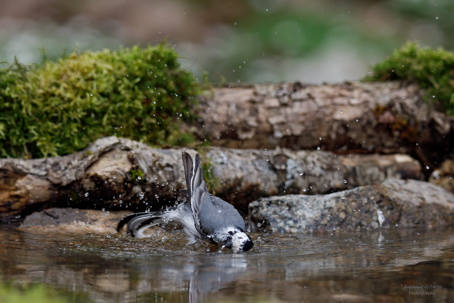 Och som den badade och plaskade runt i vårt alldeles nya ”fågelbad”, vårt vattenspeglingsprojekt. Vattnet stänkte vida omkring och mellan doppen tog den sig upp på stenen för att putsa sig lite extra fin.